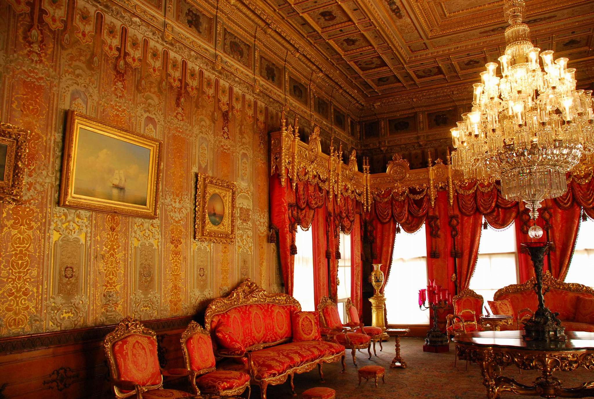 The room gets its name from the red color scheme used in its decoration, which was a symbol of power and prestige in Ottoman culture. The Red Room is lavishly decorated with gold leaf, crystal chandeliers, and ornate furnishings. The walls and ceiling are covered in intricate frescoes, featuring scenes from Ottoman history and mythology. The room also features a large fireplace, which was used to keep the room warm during the winter months.